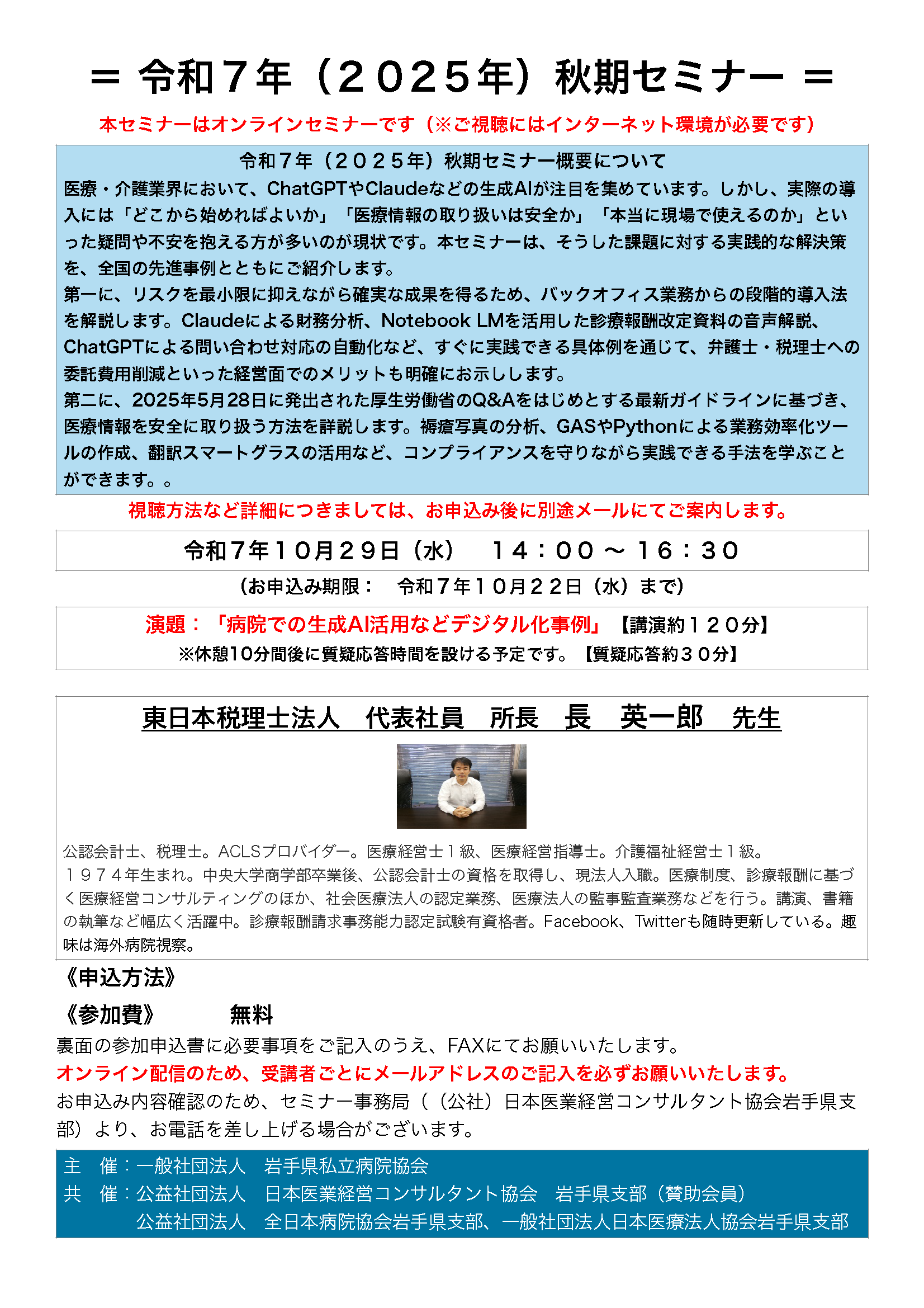 ※配信視聴登録申込書の事務手続き全ての業務(視聴方法・注意事項等)におきましては、賛助会員の日本医業経営コンサルタント協会岩手県支部様に委託させて戴いております。